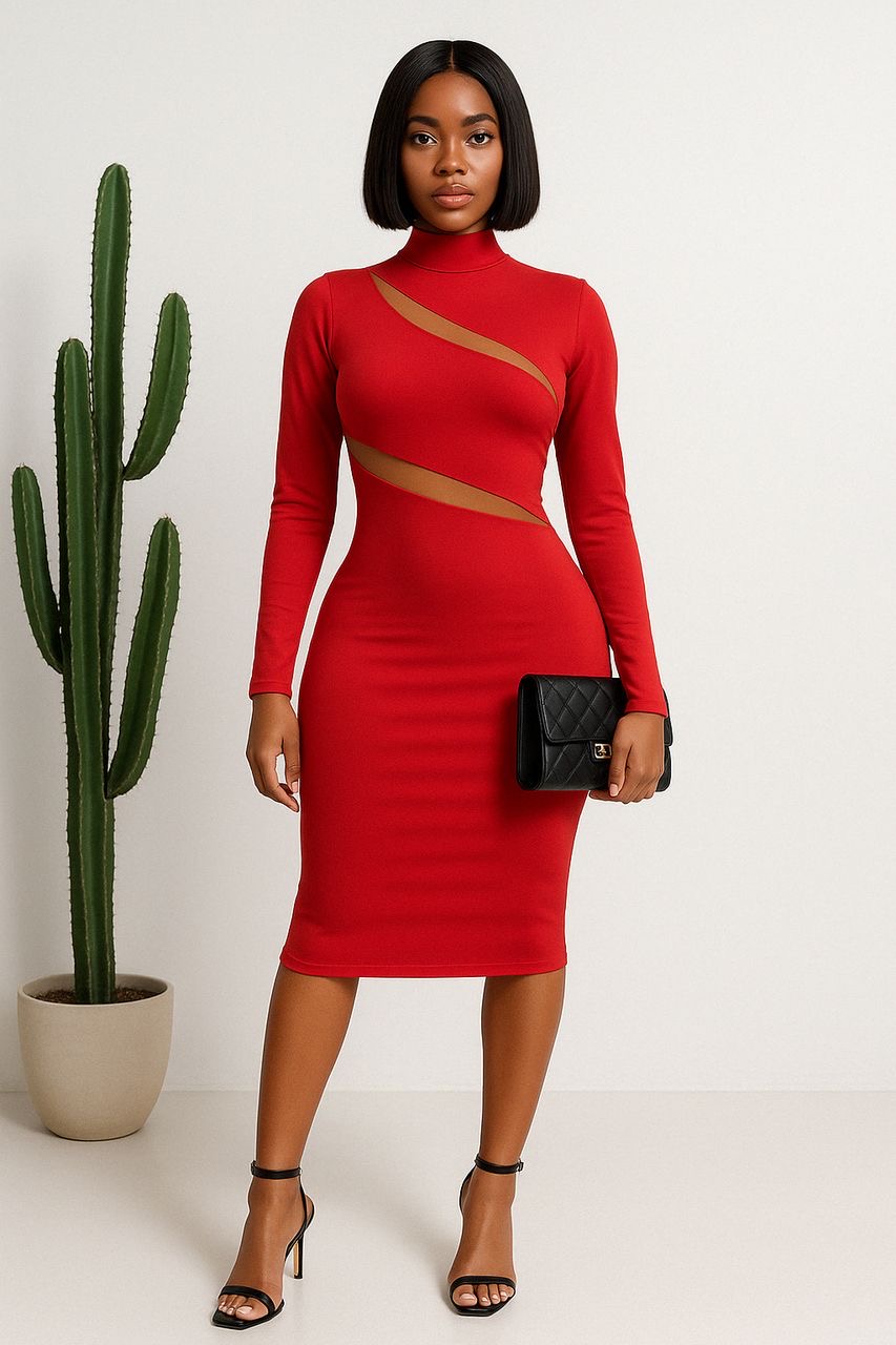 Command the room in our bold and sophisticated Red Mesh Panel Bodycon Dress – a Mellisa Black signature piece designed for the woman who owns her presence. This figure-hugging midi dress is crafted from premium stretch Lycra that flatters every curve while offering maximum comfort. The high neckline and long sleeves create a sleek, refined silhouette, while the diagonal mesh cut-out detailing adds a daring touch of sensuality. Designed to be both elegant and provocative, this statement piece transitions effortlessly from upscale dinners to red carpet-style events. Pair it with strappy heels and a clutch for the ultimate luxe look.