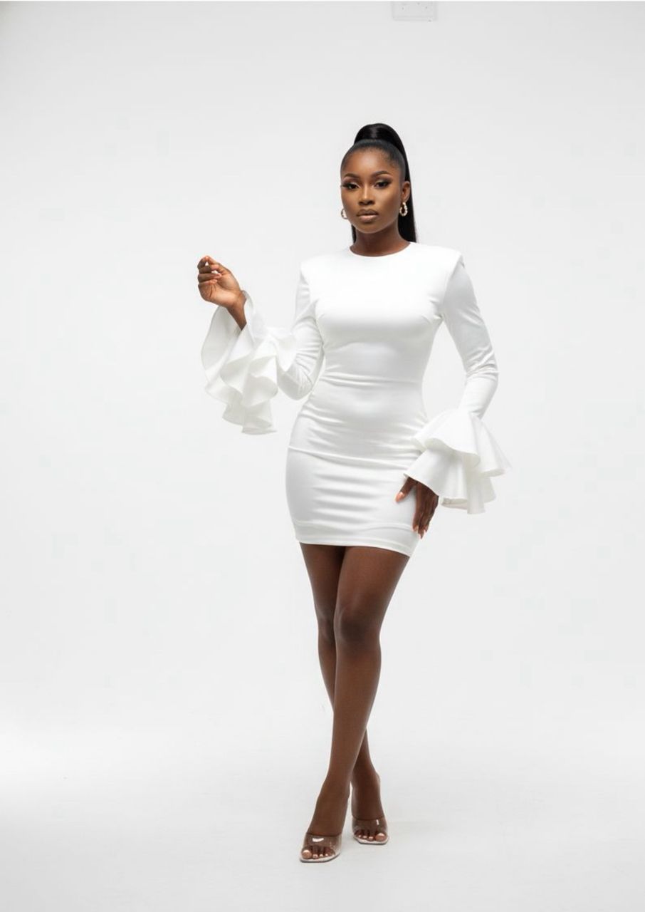 Step into effortless elegance with this stunning white mini dress, designed to make a statement while maintaining a refined and polished look. Crafted from smooth, stretch fabric, the dress contours the body beautifully, highlighting the waist and creating a flattering fit.