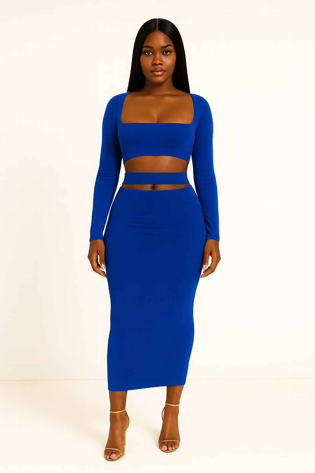 The Luxe Contour Two-Piece — sleek long-sleeve crop top and matching high-waisted midi skirt in a curve-hugging fit.