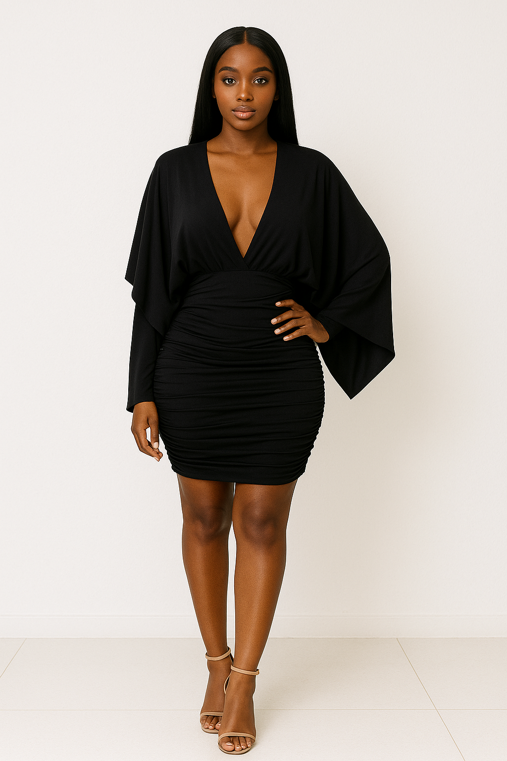 Turn heads with the Confident Elegance Mini Dress from Mellisa Black Boutique — a timeless black statement piece that blends sophistication with sultry allure. Crafted from our signature figure-hugging Lycra blend, this dress is designed to accentuate curves while offering all-day comfort. The deep plunge neckline and dramatic batwing sleeves create a bold yet graceful silhouette, while the ruched skirt detail sculpts and flatters your shape. Perfect for cocktail nights, upscale dinners, or any occasion where you want to radiate confidence and style. Pair with strappy heels and gold accessories for the ultimate high-fashion look.