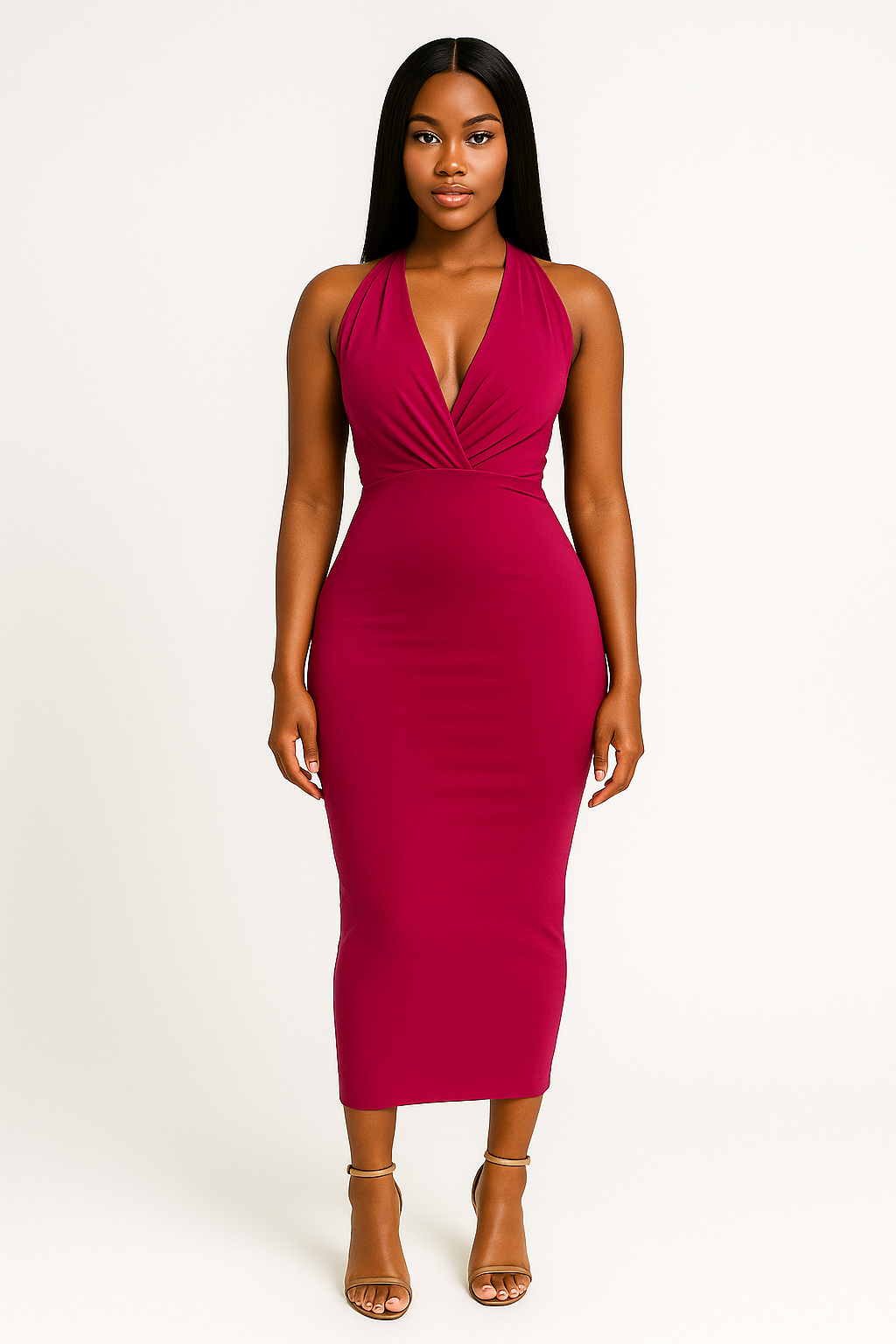 The Scarlet Elegance Midi — a halter-neck bodycon dress in a rich red tone, designed for elegance and confidence.