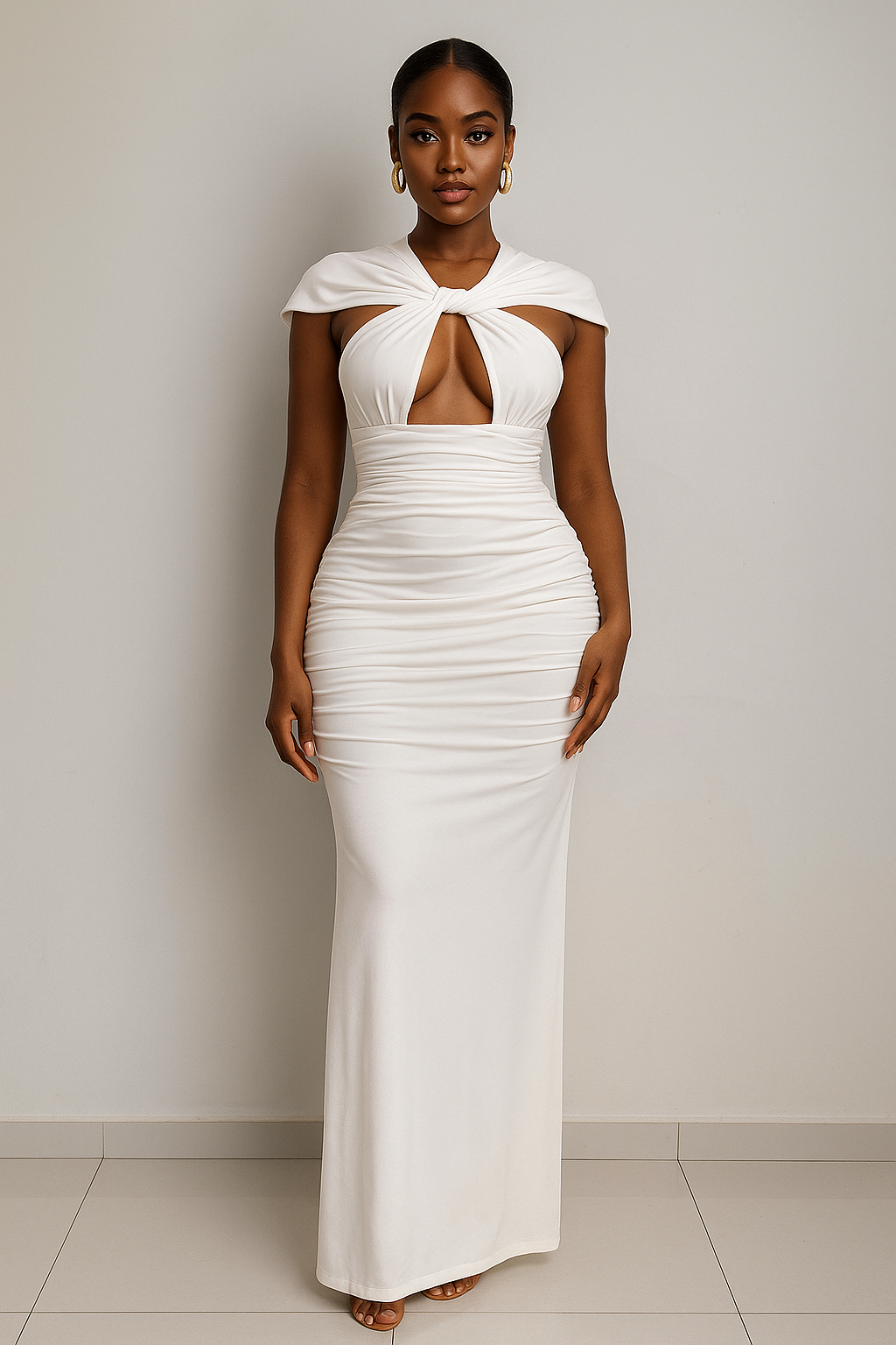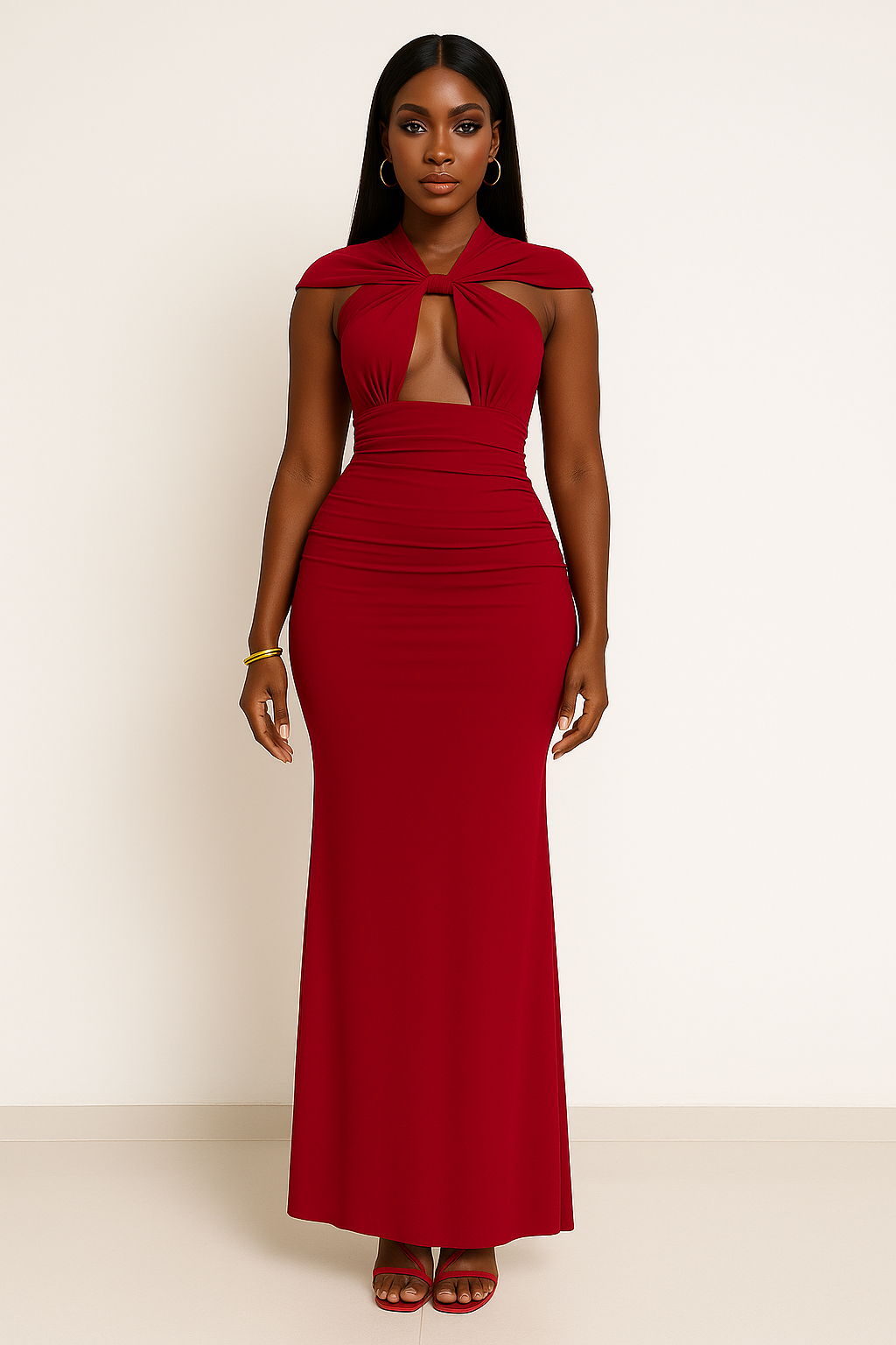The “Celeste Grace” gown – a twist-front, ruched maxi with bold cutouts and sculpted elegance.