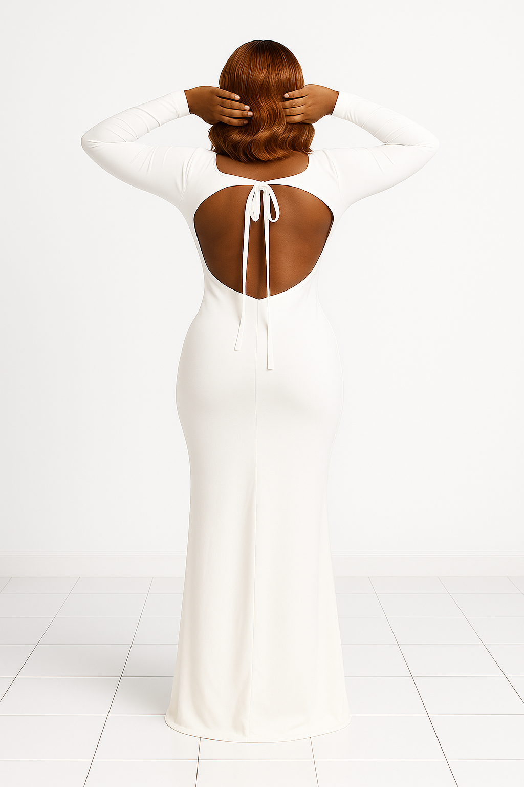 Turn heads in our “Ivory Allure” Cutout Maxi Gown – a perfect balance of elegance and daring design. Featuring a plunging V-neckline with delicate ruching, this body-hugging silhouette flows into a sleek floor-length skirt. The bold side cutout detail adds a sultry twist, offering a glimpse of skin while maintaining refined sophistication. Crafted from premium stretch fabric, it ensures a flawless fit and comfortable wear, making it the ultimate choice for upscale evenings, red-carpet events, or special celebrations.