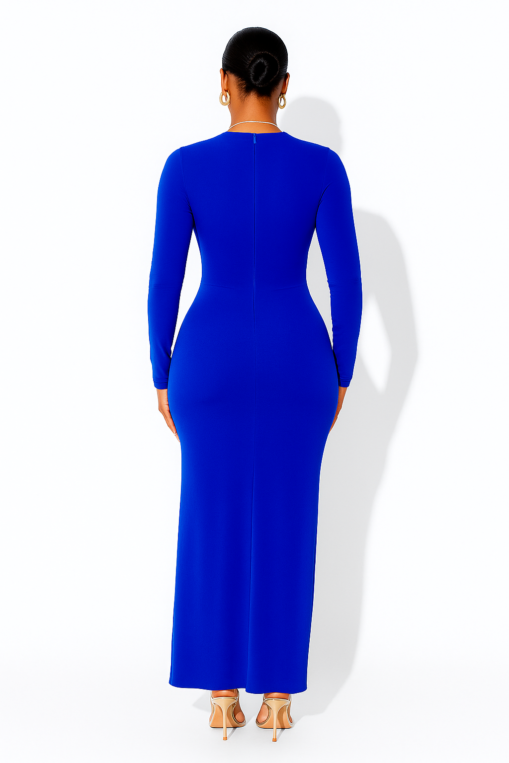 Make a bold statement in the Sapphire Allure Cutout Maxi Dress – the ultimate blend of elegance and edge. Crafted from premium stretch Lycra, this dress features a chic long-sleeve design with daring cut-outs across the bust and waist for a sultry touch. The knotted front detail accentuates your shape while the thigh-high slit adds just the right amount of drama. Perfect for date nights, special occasions, or a luxury night out, this piece guarantees all eyes will be on you.
