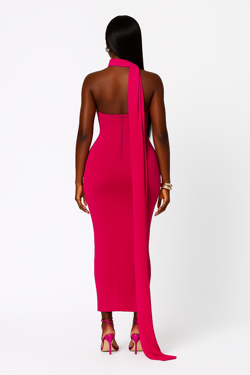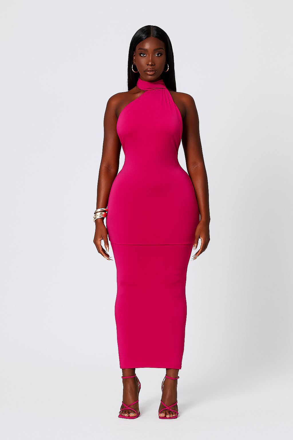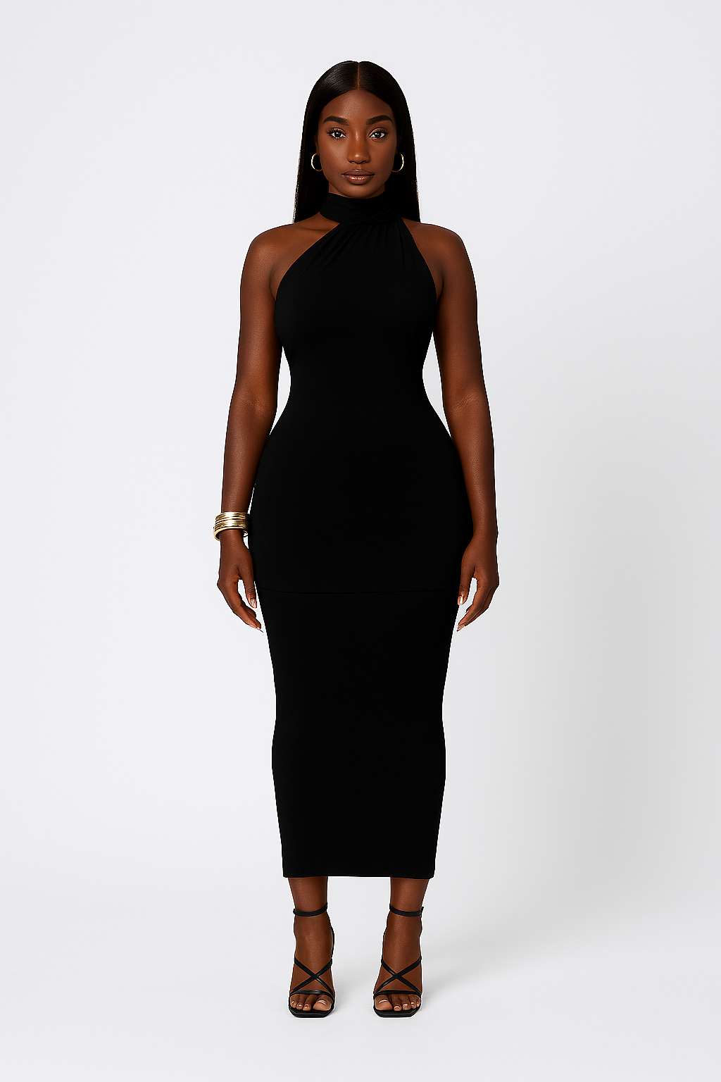 The Ava Luxe Halter Neck Bodycon Midi Dress is the perfect fusion of elegance and allure. Designed with a flattering asymmetric halter neckline, this dress sculpts your figure with premium stretch fabric that hugs your curves beautifully. The midi length keeps the look classy while the minimal detailing allows your natural beauty to shine through. Whether for date night, cocktails, or a glamorous evening out, this dress ensures you are the center of attention.