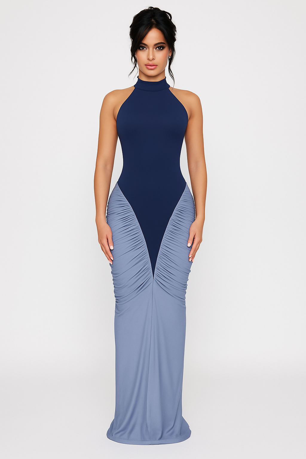 Turn heads in the Midnight Grace Gown. This sleek, body-hugging dress combines a navy high-neck bodice with soft ruched detailing in a dusty blue skirt, creating a timeless silhouette that flatters every curve.