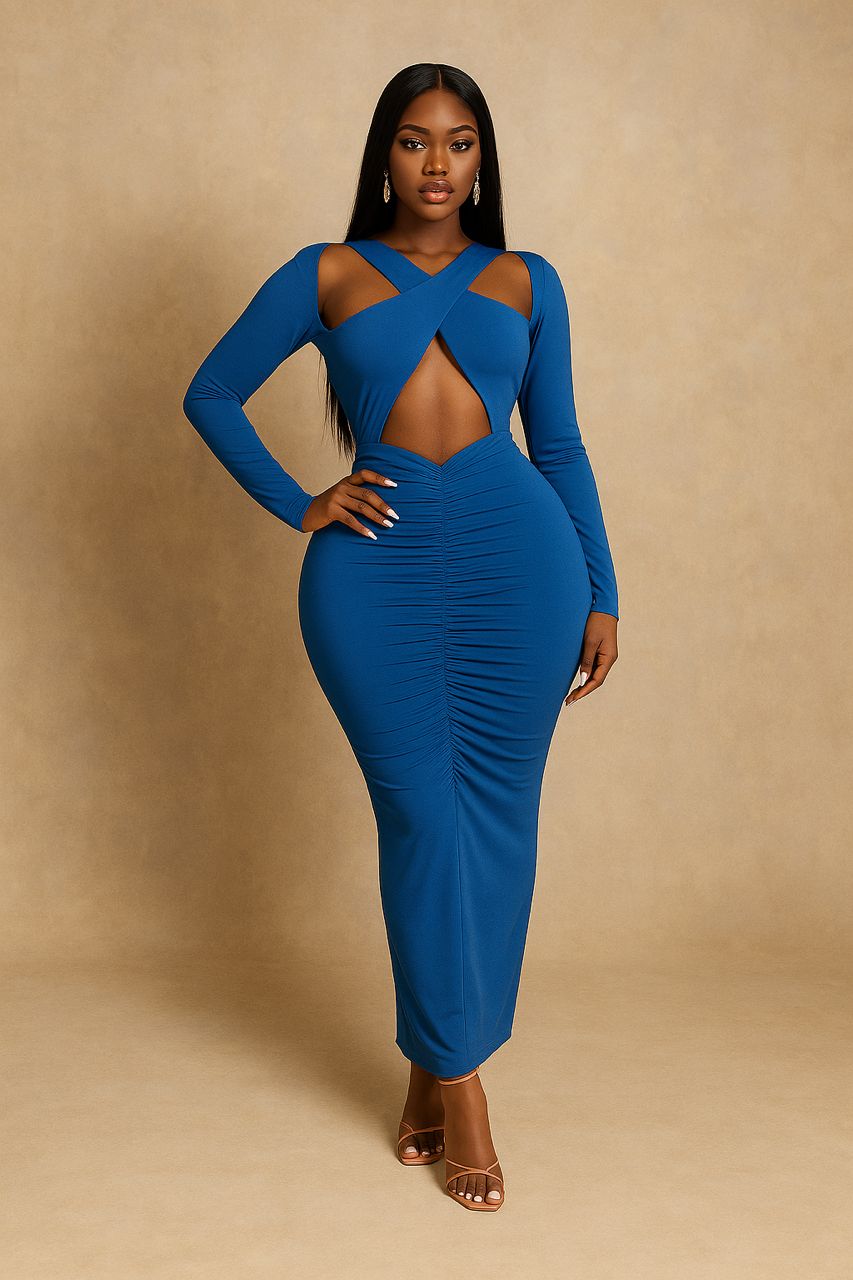 This royal blue ruched cut-out maxi dress hugs your curves and commands attention — the ultimate statement piece for a woman who owns her power.