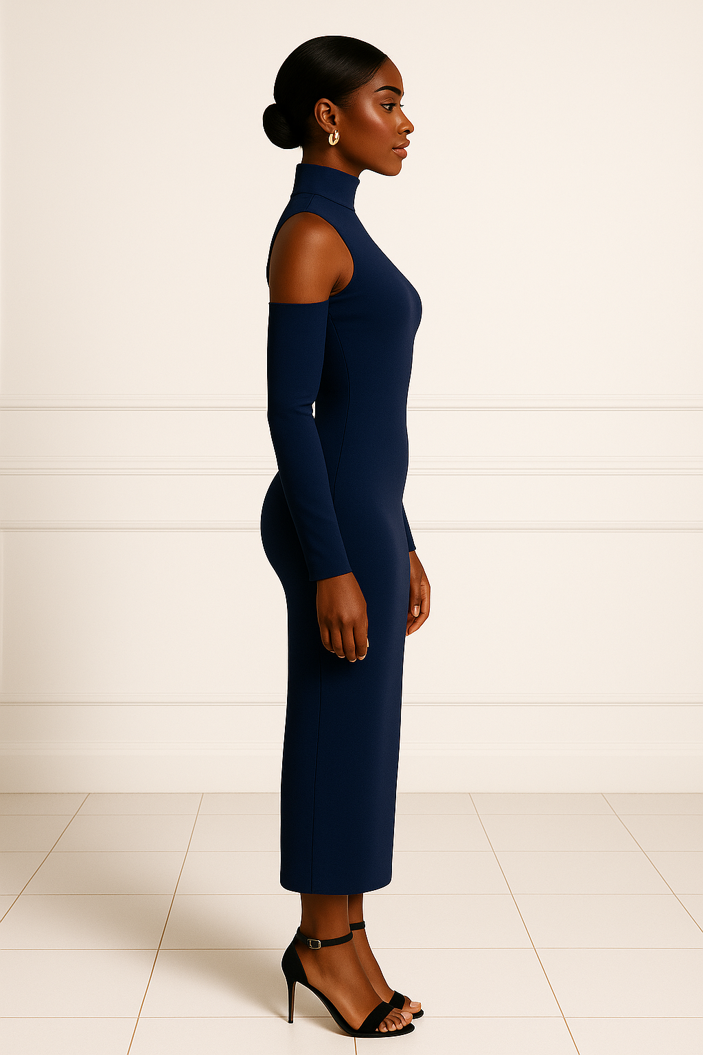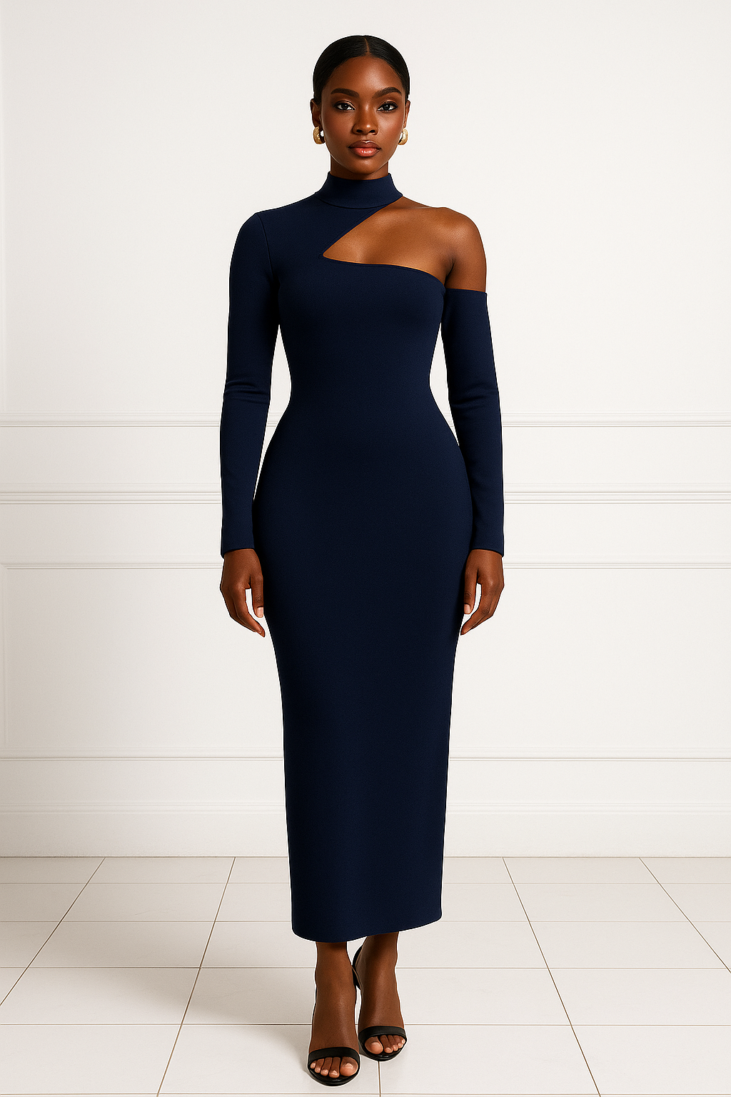 Turn heads effortlessly in our navy-blue asymmetric bodycon dress. Featuring a bold one-shoulder cut-out design, long sleeves, and a sleek high neckline, this elegant midi hugs your curves in all the right places. Perfect for dinners, dates, and all your statement moments.